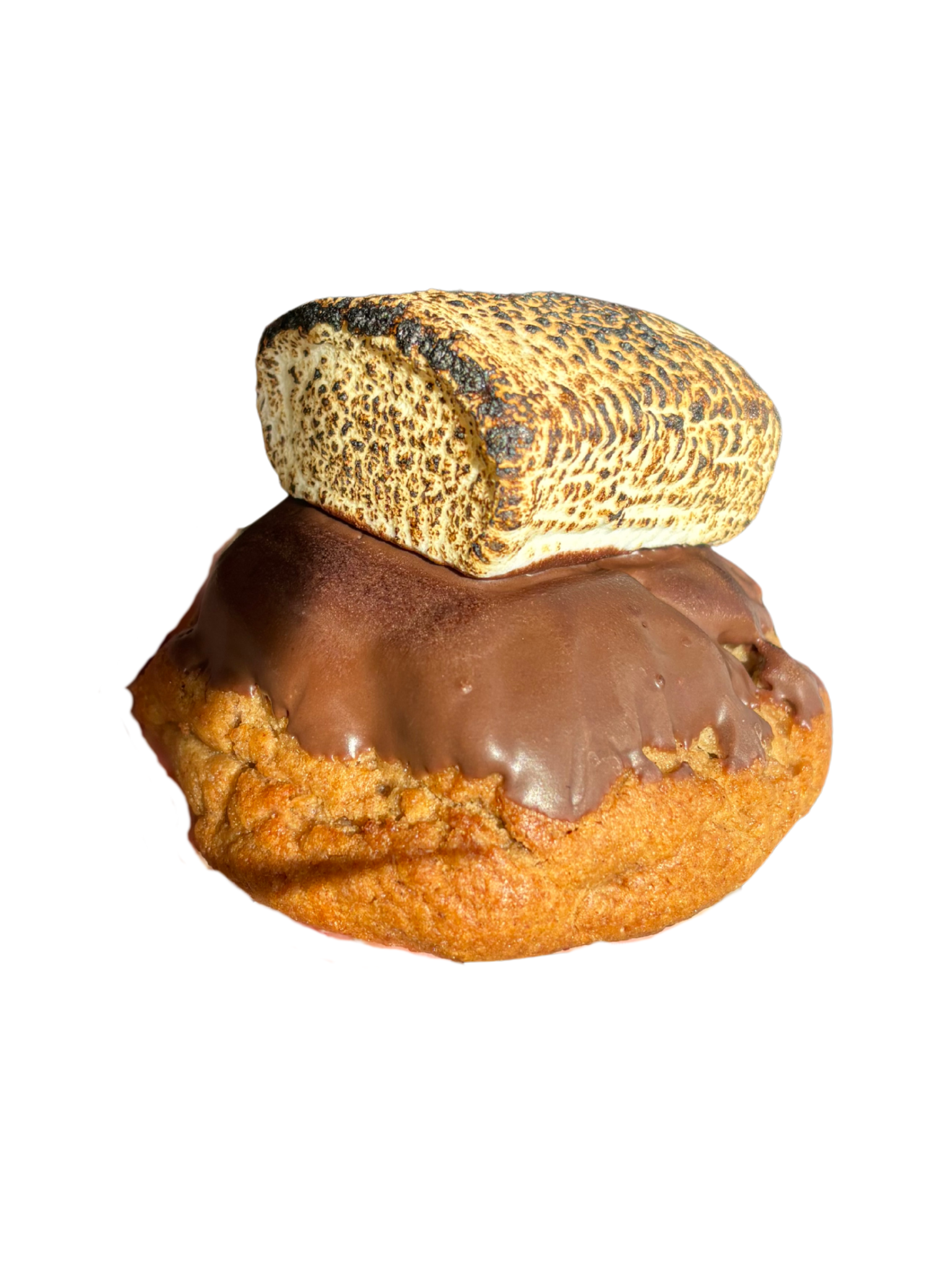 Our S’mores Cookie is the ultimate campfire treat—reinvented. Made with our homemade graham honey dough, it’s soft, buttery, and packed with cozy flavor. Each cookie is stuffed with gooey marshmallows, topped with rich melted chocolate, and finished with a big toasted marshmallow on top for that perfect golden touch. Every bite delivers the nostalgic taste of classic s’mores, no campfire required.